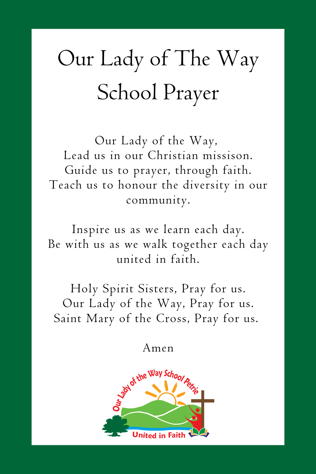 You are here:HomeThe OLW DifferenceSchool Prayer School Prayer © Brisbane Catholic Education, Our Lady of the Way School (2023)